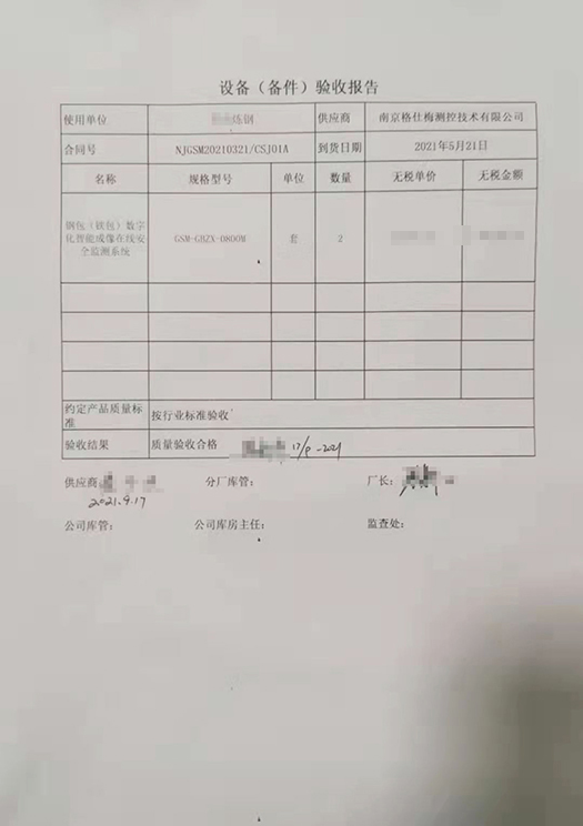 南京格仕梅公司提供的2套鋼包(鐵包)數字化智能成像在線安全監測系統于2021年5月份在某煉鋼廠組網調試成功開始運行,實現了對鋼包(鐵包)24小時全天侯的實時在線溫度變化檢測及預警,在内襯發生裂紋、鼓包的前期狀态時發現和定位缺陷點并發出報警,做到了預防性維修,減少了鋼水溢出風險,避免了安全事故的發生。