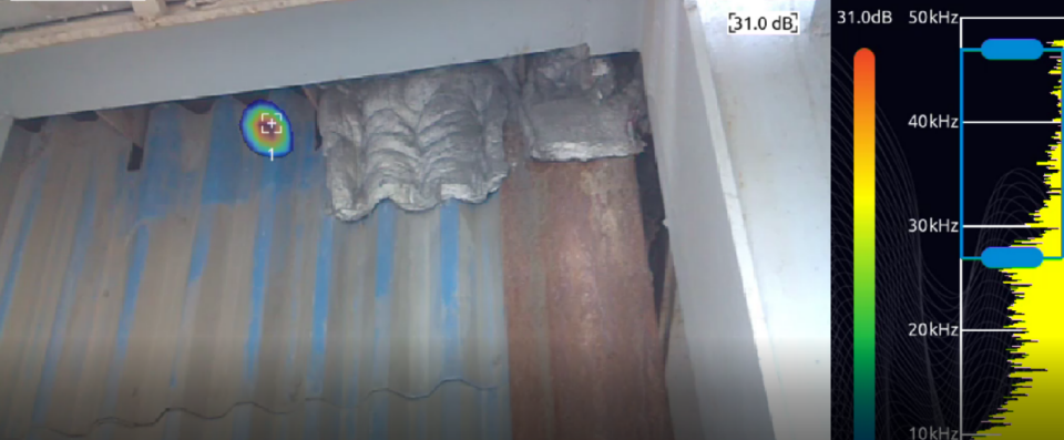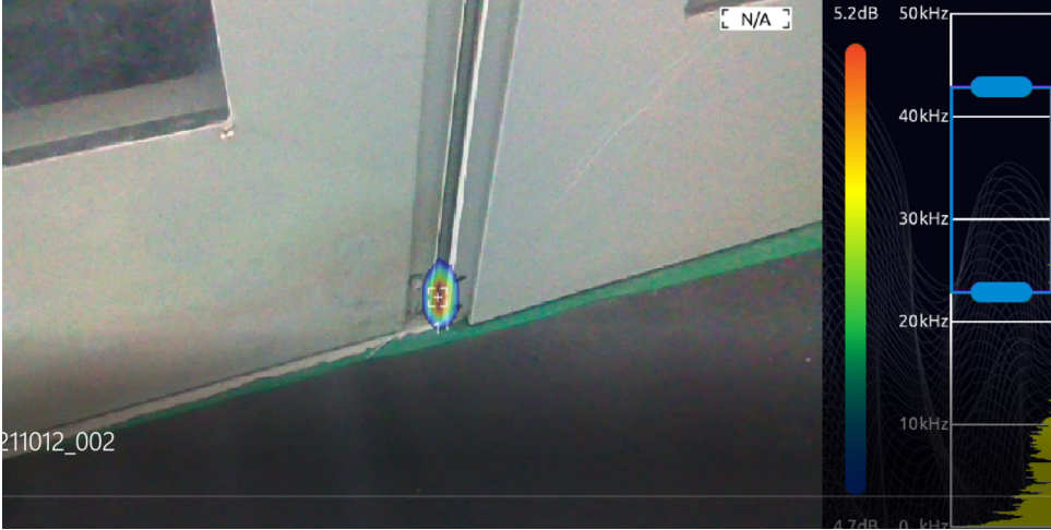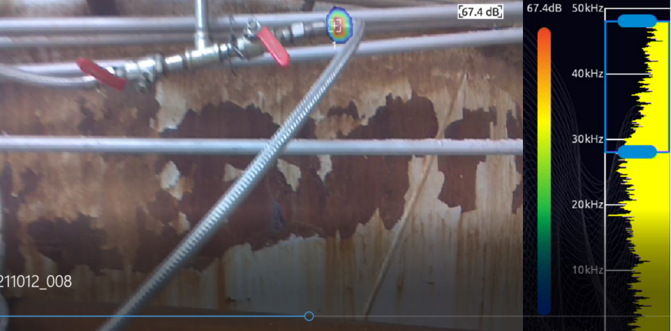 缺陷二:在脫銷反應裝置外表管線手閥處檢測到穩定聲學雲圖,頻段28KHz-48kHz成像顯示,圖示位置有穩定聲學雲圖,聲壓值67.4dB,手掌置于跟前有明顯氣流沖擊感覺,屬于壓縮空氣洩漏,建議擇機處理。